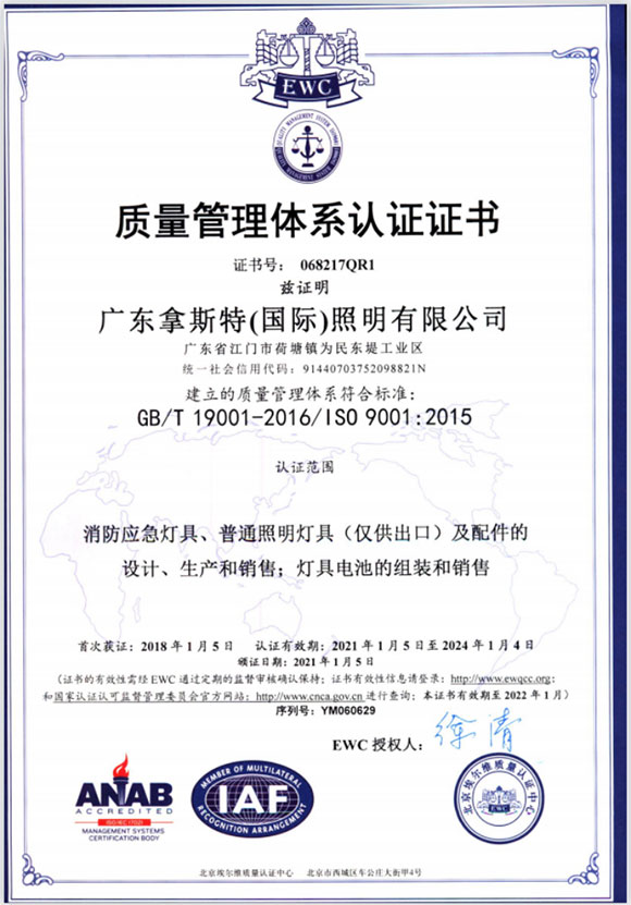 广东拿斯特(国际)照明有限公司成立于2003年7月, 位于粤港澳大湾区腹地侨乡江门,公司占地面积10万平方米, 现有员工2000多人, 是国家标准GB17945-2010《消防应急照明和疏散指示系统》、GB51309-2018《消防应急照明和疏散指示系统技术规范》和国家建筑标准设计图集19D702-7《应急照明设计与安装》的主要参编单位。多年来,拿斯特以“做全球最好的消防应急照明和疏散指示系统”为发展宗旨,所有产品均严格执行相关国家标准或行业标准,消防应急灯具全部通过国家消防电子产品质量监督检验中心检验,均有国家标准的产品均严格执行国家标准,并已获3C证书。 作为“消防安全的守护者”,经过近二十年的发展和积淀,拿斯特已经成为现代公共建筑消防应急照明和疏散指示系统产品的首选供应商/火灾报警配套商。产品在首都毛主席纪念堂、北京国际机场、“鸟巢”、“水立方”、上海环球金融中心、浙江环球中心、广州国际会展中心、广州大学城、广州新电视塔“小蛮腰”、各大机场、地铁、酒店、高端写字楼、购物中心、大型医院等人员密集的场所广泛使用, 为人员安全疏散、 消防救援作业提供疏散指示和应急照明,保障人民群众的生命安全。 拿斯特坚持“以技术创新塑造强势核心竞争力”的理念,所生产的产品大部分为专利产品,目前已获得发明专利、实用新型专利和外观专利共300多项,其中一项技术获得美国发明专利。拿斯特组建的消防应急灯具工程技术研究中心被江门市科技局审核评定为广东省江门市工程技术研究中心;拿斯特自主研发的消防应急灯产品连续多年被评为“广东省名牌产品”和“广东省高新技术产品”;拿斯特消防应急照明和疏散系统软件获得国家版权局颁发的《计算机软件著作权登记证书》,拥有自主知识产权。2019年,拿斯特推出第二代专利LED消防应急标志灯;2020年,拿斯特推出拥有多项专利的柔性标志灯和可能是全球最薄的0.38CM标志灯,以及新中式消防应急系列灯具,进一步彰显了拿斯特的科技创新能力持续走在行业前列。 拿斯特凭借卓越的品牌和出色的品质,赢得了国家权威机构和广大消费者的高度认可,先后荣获中国质量检验协会理事单位、中国科技创新十佳示范单位、国家高新技术企业、全国产品和服务质量诚信示范企业、广东省守合同重信用企业、中国LED照明灯饰行业100强企业、行业十大民族企业、智能疏散十大品牌、智慧消防领军品牌、智慧消防特别推荐品牌、中国建筑电气十大品牌、中国消防行业CCC认证消费者放心产品等殊荣。 在质量管理、节能环保和职业健康安全方面,拿斯特秉持可持续发展理念,对质量、环境、安全等环节中的管理流程不断完善,并通过有效运行,提高全体员工的质量、环保和健康安全意识,公司现已通过ISO9001:2015质量管理、ISO45001:2018职业健康安全管理、ISO14001:2015环境管理等体系认证。 坚持办良心企业、铸良心品牌、造良心产品,是拿斯特永恒的宗旨。拿斯特坚持以顾客需求和社会责任为导向,秉持“靠科技打造精品,凭质量赢得市场”的经营理念,依托完善的质量体系、严谨的科学管理、先进的生产和检测设备、丰富的规模化生产经验,为用户提供优质、美观、安全、耐用、节能、环保且符合国家标准的高性价比产品,引领消防应急照明和疏散指示系统行业持续健康向前发展。