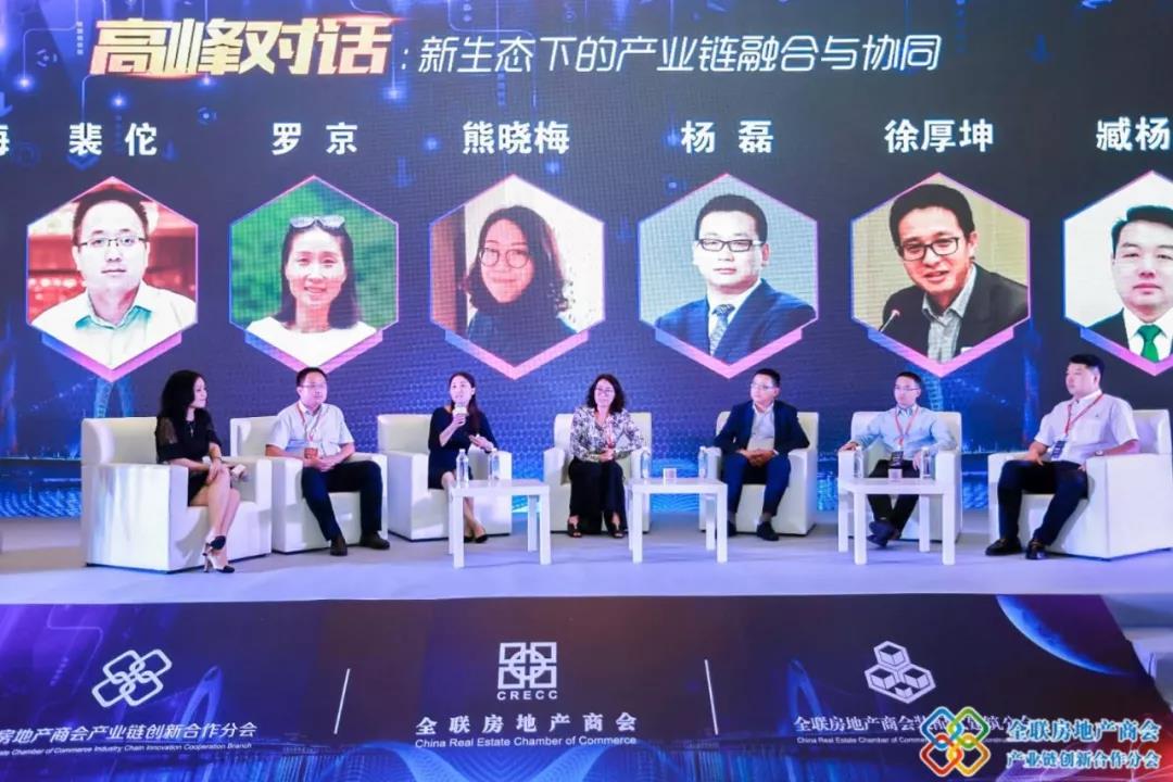在高峰对话环节里,嘉宾主持人全联房地产商会产业链创新合作分会副秘书长、颐和地产副总裁丁雪梅女士与全联房地产商会副会长单位、卓越置业集团成本战采部总经理裴佗先生;全联房地产商会产业链创新合作分会常务理事专家、时代中国控股有限公司集团成本中心总经理罗京女士;珠江投资集团成本管理中心副总经理熊晓梅女士;贝朗(中国)研销中心总经理杨磊先生 ;圣象集团有限公司副总经理徐厚坤先生;君诚管道实业集团有限公司江南大区副总经理臧杨春先生等产业链专家朋友以“新生态下的产业链融合与协同”为话题,为大家带来一场精彩的头脑风暴和智慧盛宴。