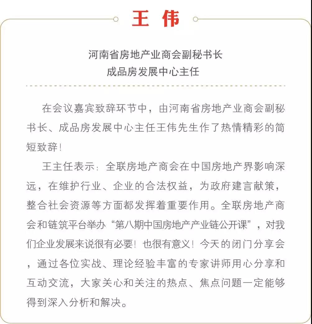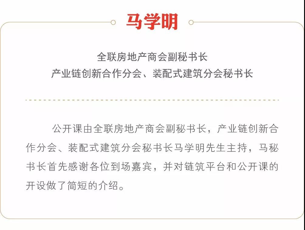 该公开课是由全联房地产商会携手链筑平台主办的“中国房地产产业链公开课”系列活动之一。旨在积极推动产业链上下游的深度融合与协同发展,积极探索供应链管理创新与装配式建筑全产业链的健康有序发展。本次活动是由全联房地产商会产业链创新合作分会、装配式建筑分会承办,河南省房地产业商会特别支持。