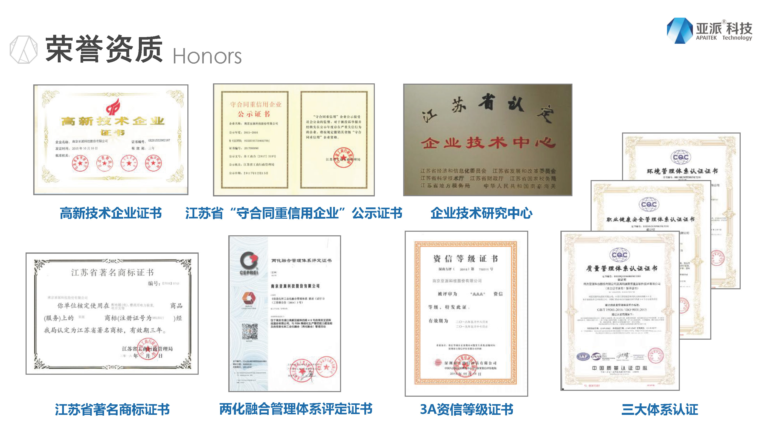 这是我们取得的一些资质,高新技术企业证书、江苏省守合同重信用企业公示证书、企业技术研究中心、江苏省著名商标证书、两化融合管理体系评定证书、3A资信等级证书、三大体系认证。
