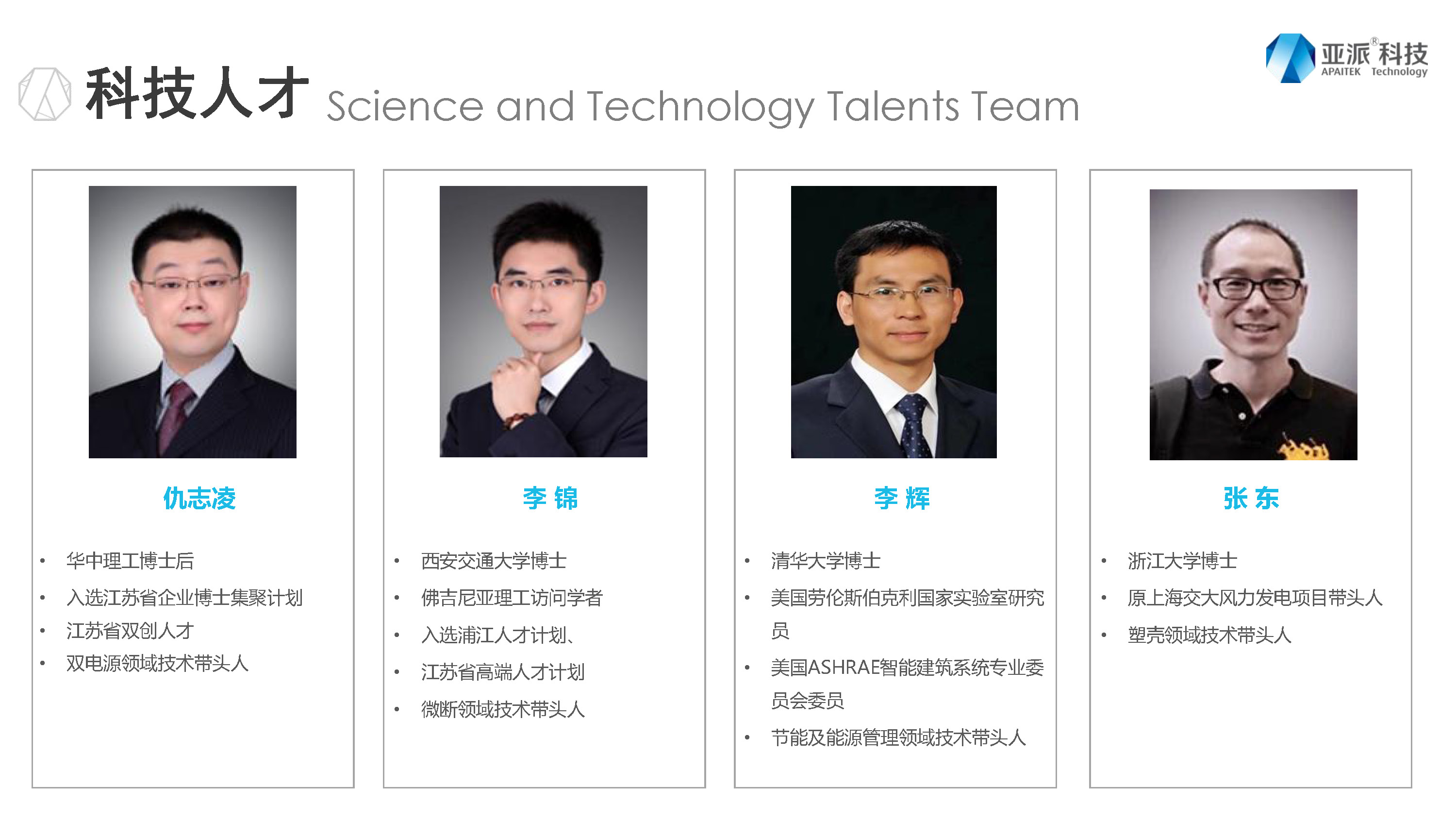 这是我们亚派科技的一些研发人才,仇志凌,华中理工博士后,是我们双电源领域的带头人;李锦,西安交通大学博士,微断领域的带头人;李辉,清华大学博士,伯克利实验室研究员,是我们节能及能源领域技术领头人,张东,浙江大学博士,是我们塑壳领域技术带头人。