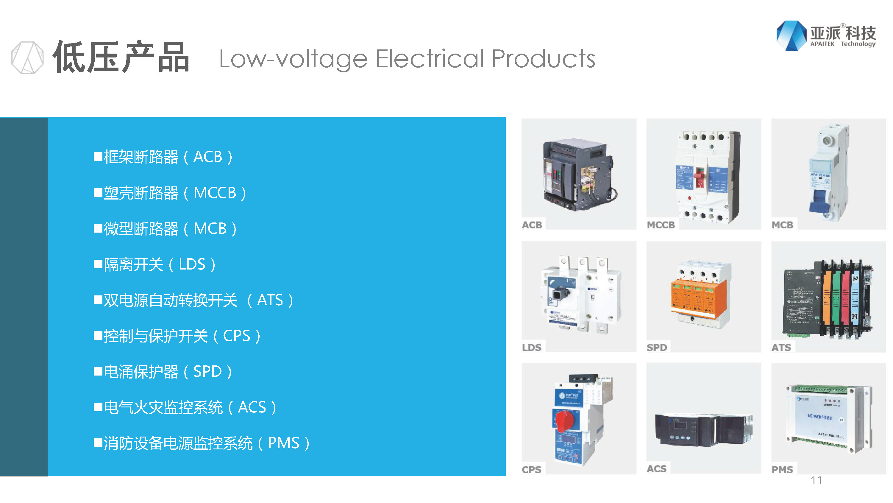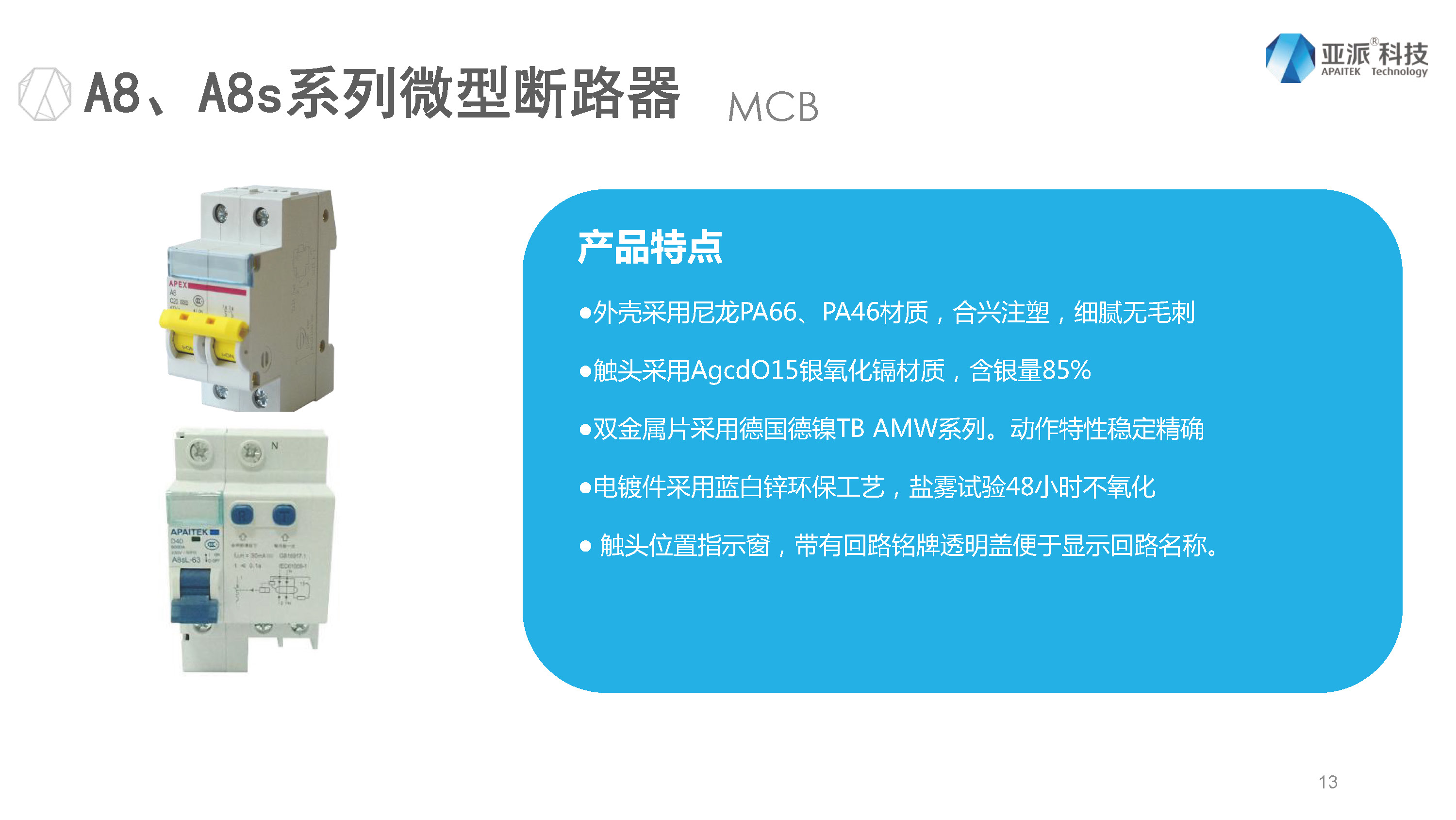 第二章节介绍一下我们的产品,主要介绍的是我们的低压产品,从400伏的配电房、框架、塑壳到每家每户的微断,到地下室、楼层配电箱里面的双电源、控保、保护器、电器火灾系统、消防设备电源监控等等,我们有从配电房到末端的一整套产品,双电源是亚派的起家产品,跟很多大的地产都有合作,很多人都知道亚派双电源。产品特点是一体式积木结构,体积小、重量轻,励磁驱动,线圈瞬间吸合完成转换,速度快、功耗小、寿命长等等。