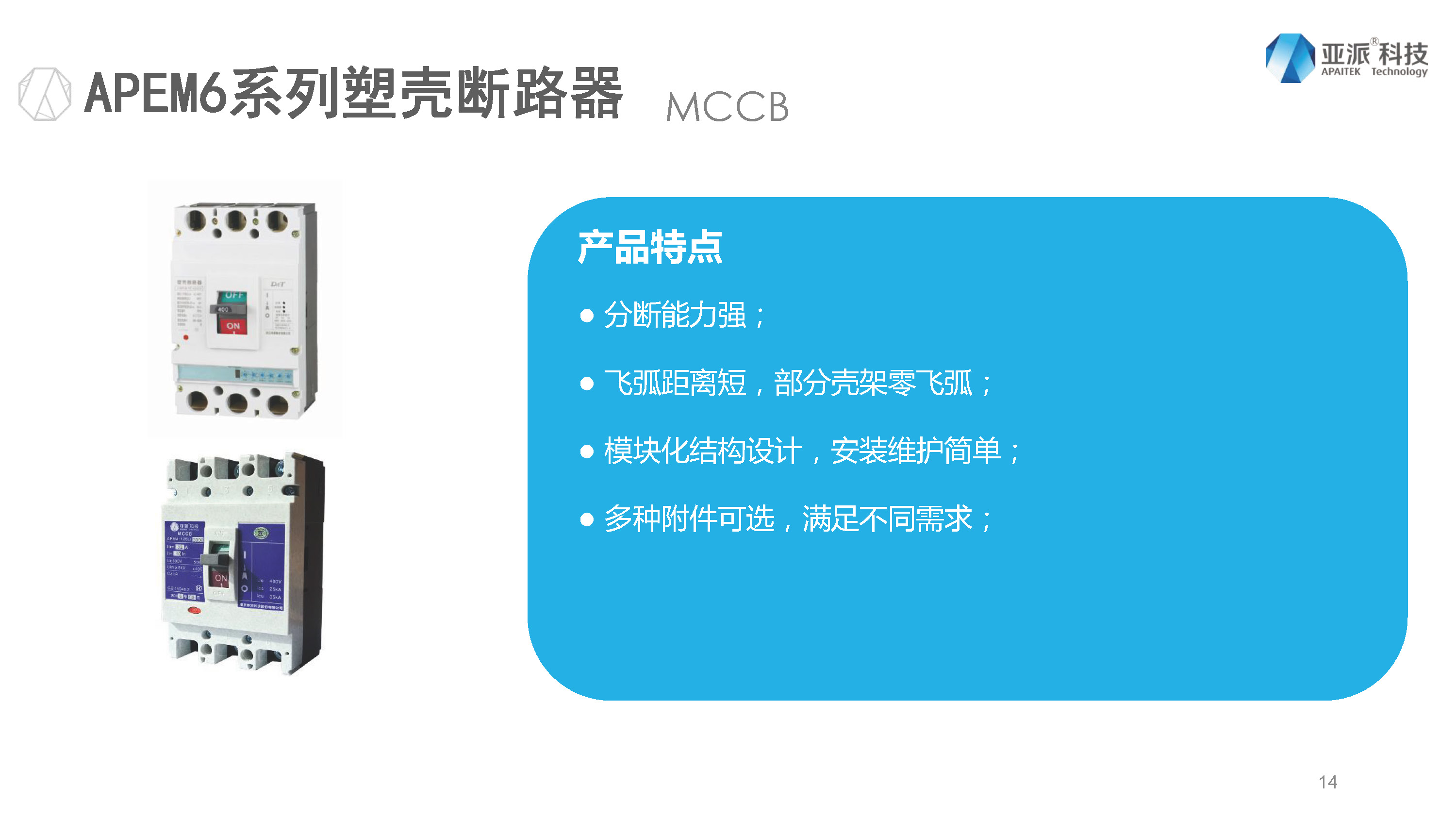 这是我们的塑壳断路器,产品特点是分断能力强,飞弧距离短,满足不同需求。