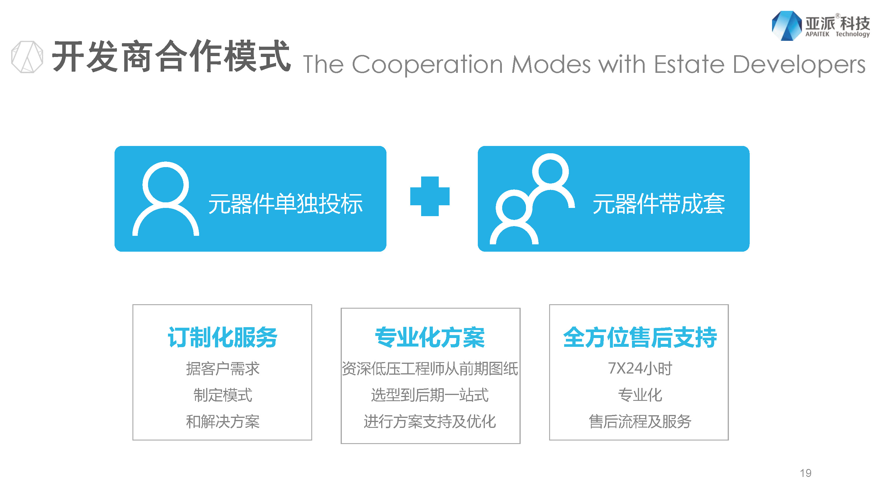 第三个章节给大家介绍一下目前我们亚派的服务和合作伙伴,目前开发商的合作模式有两种,针对元器件这块,第一种是元器件单独招标,第二种是元器件带成套,我们提供的服务,第一是定制化服务,根据元器件单独招标还是元器件带成套,根据客户需求制定模式和解决方案,我们有专业化方案,有资深低压工程师从前期图纸选型到后期一站式进行方案支持及服务,全方位售后支持,7×24小时专业化售后流程及服务。我们在全国有12大区域,30个办事处,有150名销售和服务工程师,通过分布在全国主要城市的网络、技术支持人员及经销商网络实现就近联系、就近支持、就近服务,咨询服务热线是4000818200。