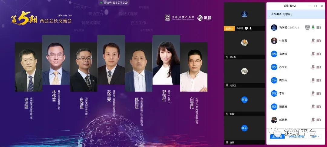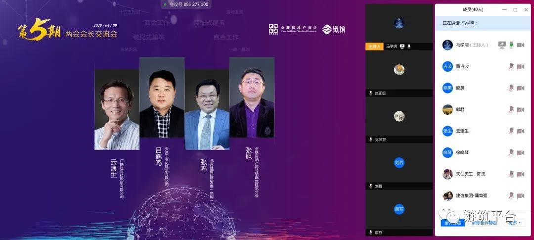 当前,我国疫情防控形势持续向好,社会经济发展和生产生活秩序加快恢复。在抗击疫情过程中,火神山、雷神山等各地医院的高效建设,不仅为防控疫情做出巨大贡献,同时也充分展现了装配式建筑的效率优势。在政策不断蓄力以及新技术应用的双重加持下,我国装配式建筑有望迎来高速增长的发展时期。长远来看虽然发展潜力巨大,但仍面临着应用普及程度尚未达到预期的问题。因此,为进一步探究装配式建筑的发展困境,推动市场广泛应用和普及。2020 年 4 月 9 日下午,全联房地产商会装配式建筑分会、产业链创新合作分会联合召开了“携手抗疫•共克时艰,链筑两会第五期会长交流会”在线会议,此次会长交流会汇聚了全联房地产商会、中国建筑金属结构协会、江西省建筑业协会的商协会领导专家及保利湾区投资发展、碧桂园控股、旭辉集团、龙湖地产、北大资源、朗诗集团、世茂集团、陕建发展、远大住工、德国(贝朗)、华德隆建材、中建科工、北新建材、美好置业、中民筑友、绿筑集成、天住天工、杭州之江、奋发科技、君诚管道、米兰之窗、广联达、建谊集团、南京亚派等两会副会长和产业链企业代表共近50位领导嘉宾的参与。
