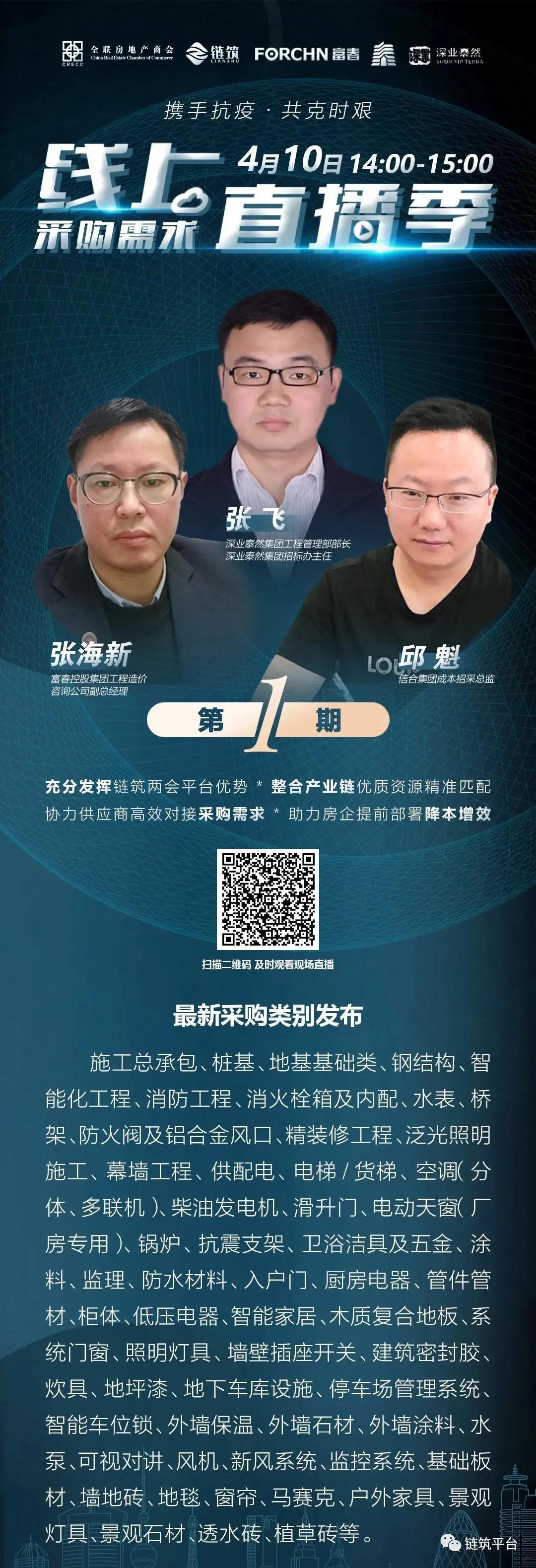 4月10日,第1期参与直播的富春控股、信合集团、深业泰然(集团)三大房企携60余项采购需求直播干货来了!链筑线上采购需求直播季正式开启!
