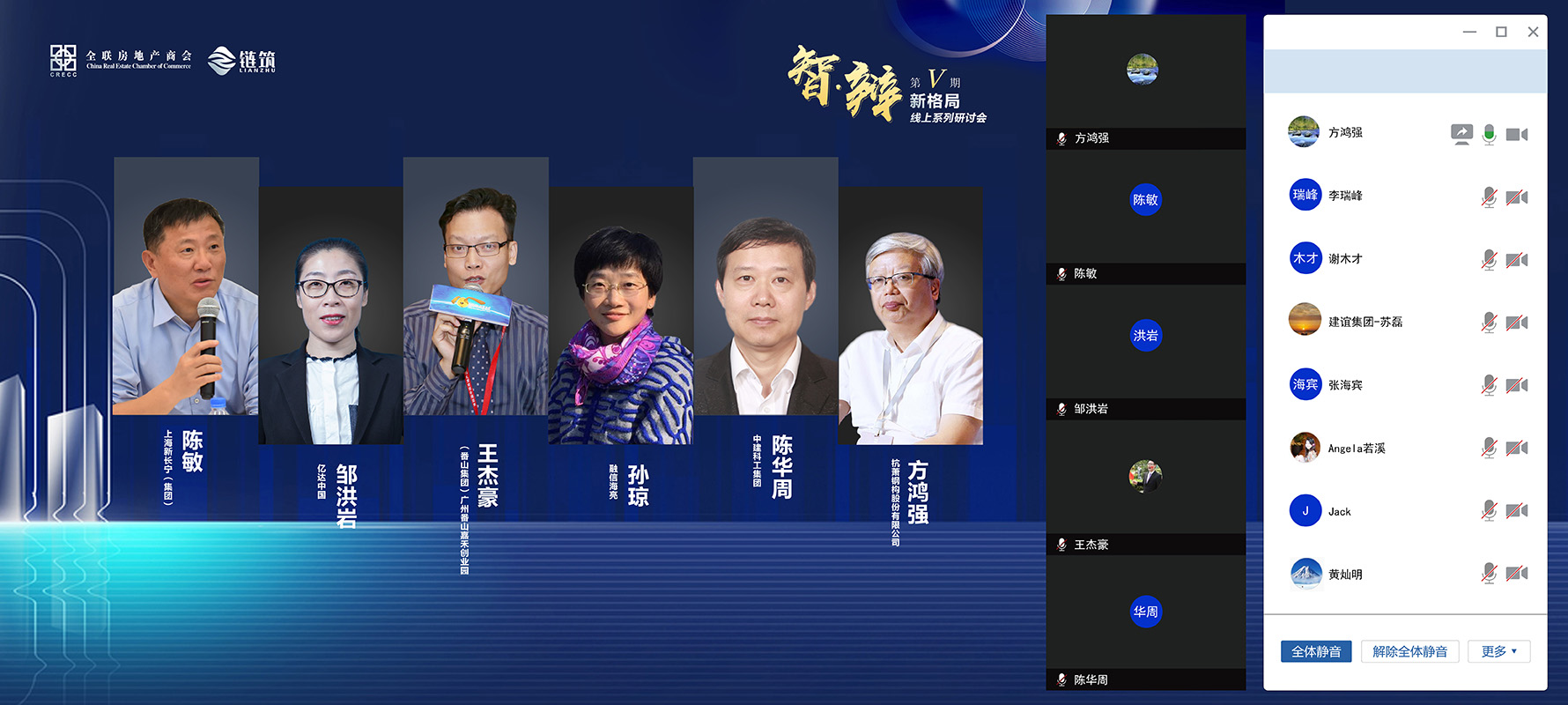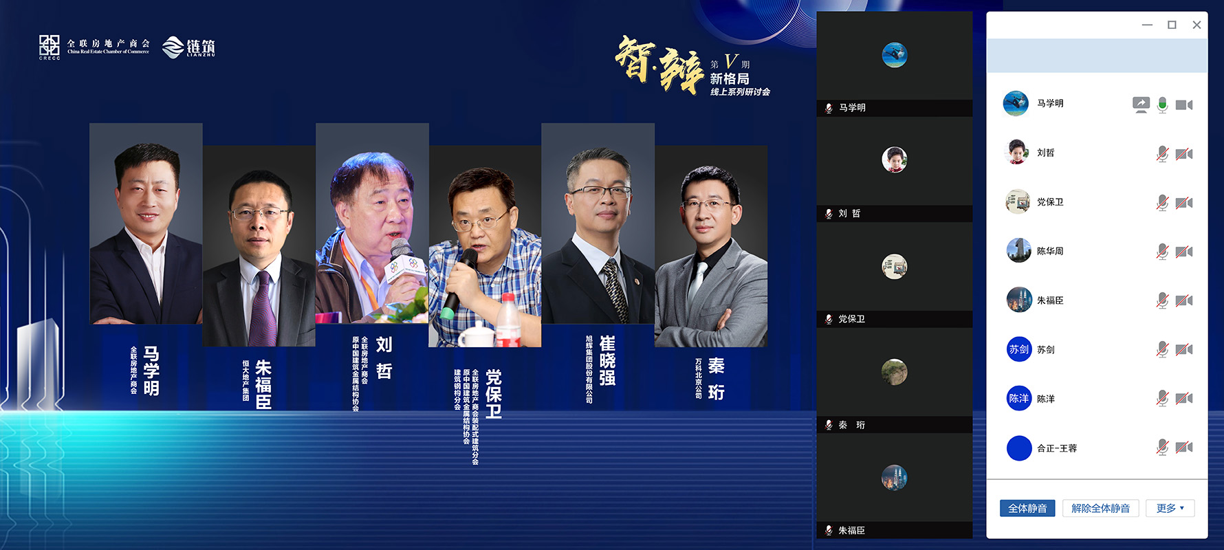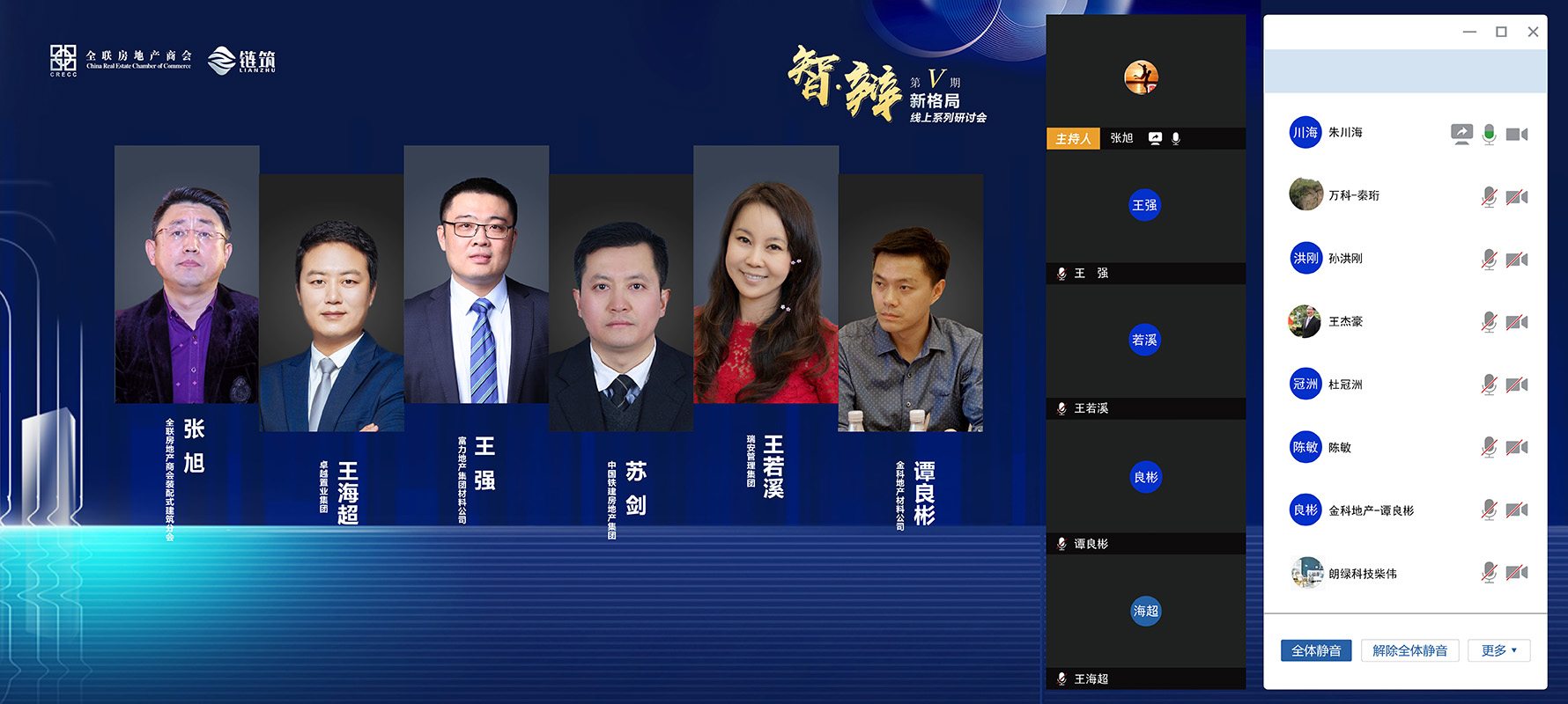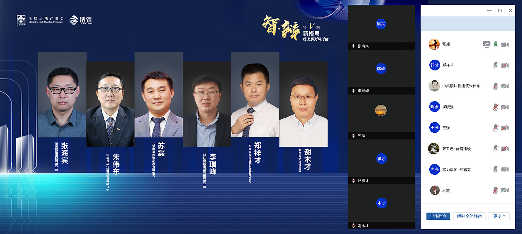 本次研讨会由全联房地产商会、链筑两会共同发起,链筑两会主办,汇聚了商协会领导以及恒大集团、中建科工、万科集团、旭辉集团、中铁建地产集团、新城控股、富力集团、奥园地产、瑞安集团、卓越置业、鲁能集团、金科地产、融信海亮、当代置业、亿达中国、鸿坤地产、广州番山、上海新长宁、深圳合正、众安集团、亚东集团、杭州市房地产集团、升龙集团、保集集团、金侨集团、一方控股、朗绿科技等百强地产企业及杭萧钢构、绿筑集成科技、首钢建设、建谊集团、莱钢建设、中集建投、联兴绿厦、龙元明筑等钢结构领域的代表企业共近60余位嘉宾汇聚线上,共商行业发展之策。