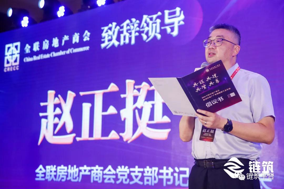 全联房地产商会党支部书记、秘书长赵正挺先生宣读“共谋、共建、共管、共享——推动房地产产业链健康生态发展倡议书”