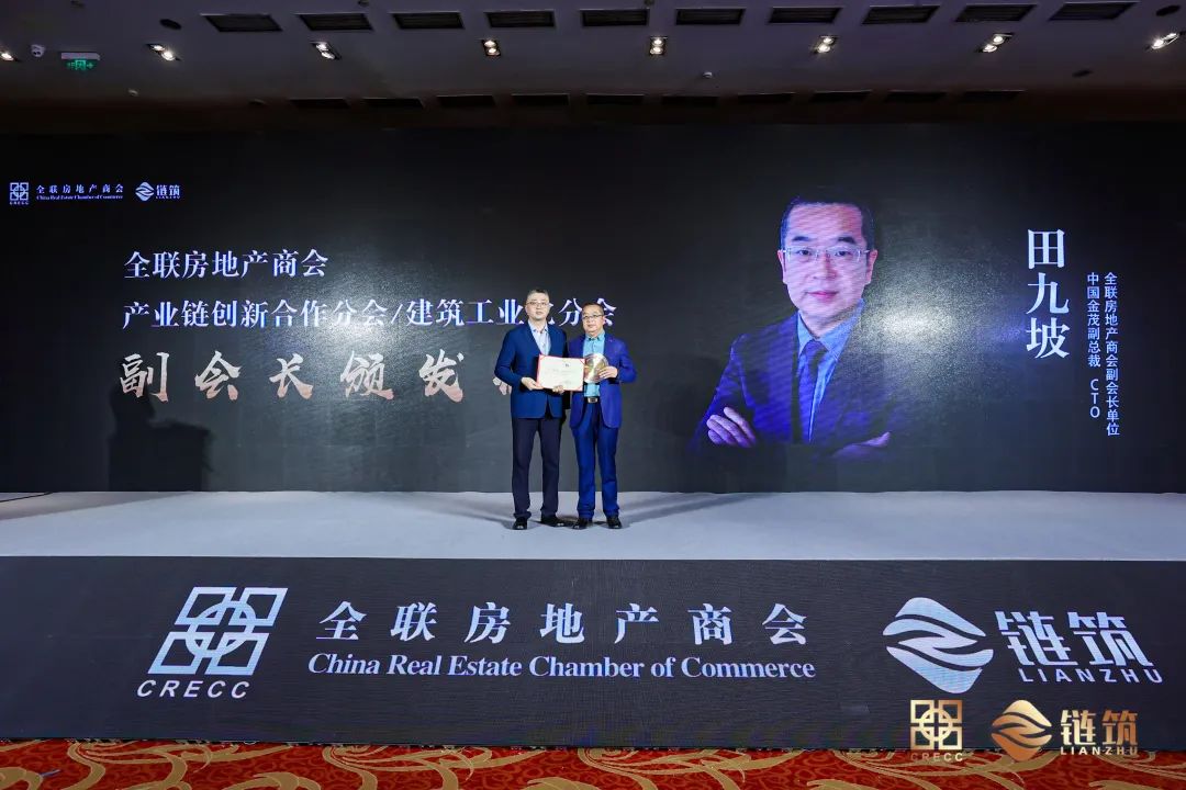 全联房地产商会党支部书记、秘书长赵正挺先生为全联房地产商会副会长单位、中国金茂副总裁、CTO田九坡先生颁发全联房地产商会产业链创新合作分会和建筑工业化分会副会长证书。