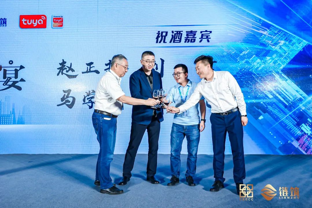 全联房地产商会党支部书记、秘书长赵正挺先生;全联房地产商会链筑两会战略顾问刘哲先生;全联房地产商会副秘书长马学明先生;涂鸦智能中国区智慧地产商务总监檀小亮先生,共同为今天的涂鸦智能答谢晚宴祝酒。