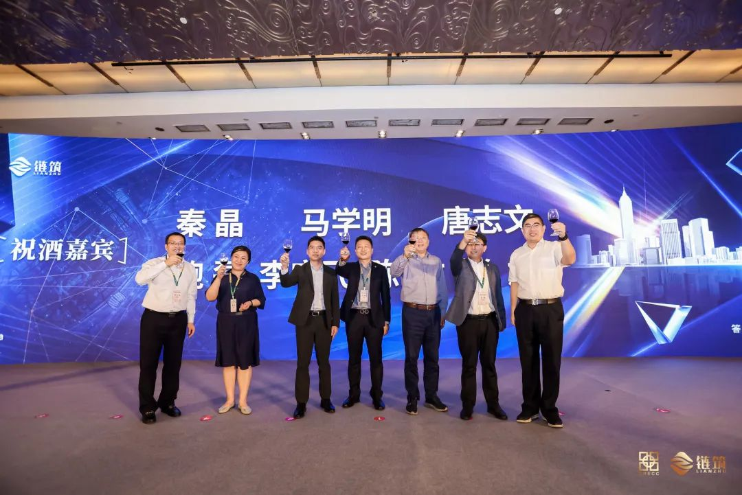 全联房地产商会副秘书长秦晶女士;全联房地产商会副秘书长、链筑分会秘书长马学明先生;链筑分会副会长单位、德国贝朗(中国)内装运营中心总经理唐志文先生;链筑分会—李守飞副秘书长、陈敏副秘书长、鲍磊副秘书长、张旭副秘书长共同为华北站论坛答谢晚宴祝酒。