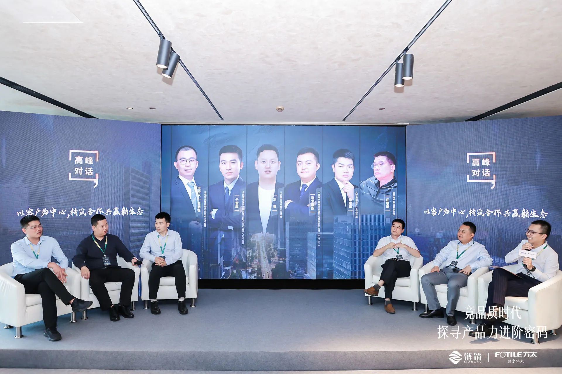 本次对话由全联房地产商会副会长单位、链筑分会主席团专家、新城控股集团合约规划中心总经理葛明锋先生担纲主持,邀请到全联房地产商会链筑分会主席团专家、中海地产领潮供应链公司常务副总经理端木颖新先生;国贸地产集团副总经理庄联郎先生;华润置地深圳大区东莞片区公司产品中心副总经理于智超先生;全联房地产商会链筑分会副会长单位、方太集团战略客户总经理刘晋先生;全联房地产商会链筑分会副会长单位、九牧集团地产行业总经理詹建朝先生一同上台互动交流。