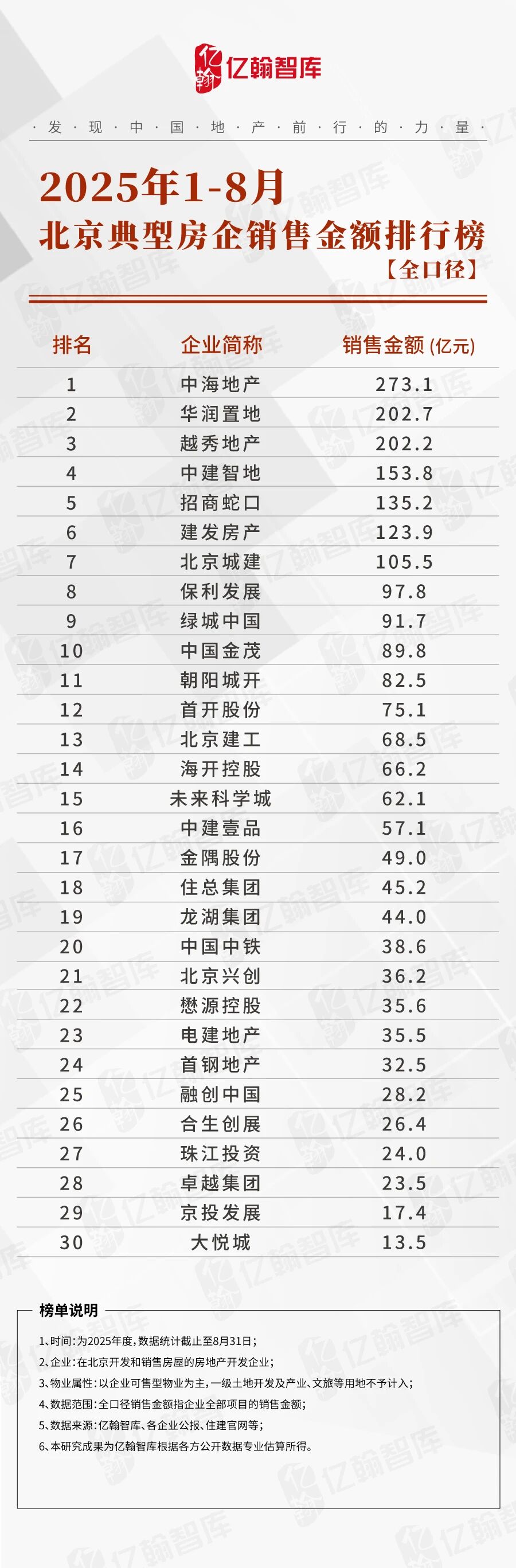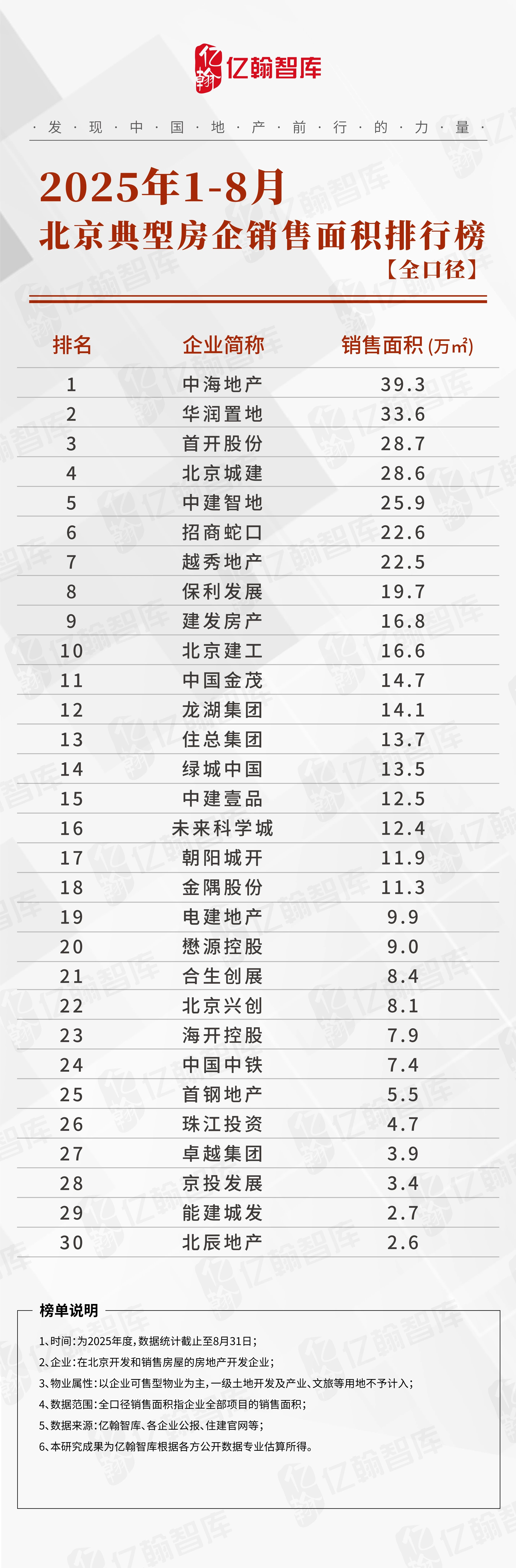 2025年1-8月,北京典型房企全口径销售排行榜中,TOP30房企全口径销售金额合计2336.7亿元,中海地产、华润置地和越秀地产分别以273.1亿元、202.7亿元和202.2亿元位列全口径销售金额TOP3;北京TOP30房企全口径销售面积合计431.9万㎡,中海地产、华润置地和首开股份分别以39.3万㎡、33.6万㎡和28.7万㎡位列全口径销售面积TOP3。