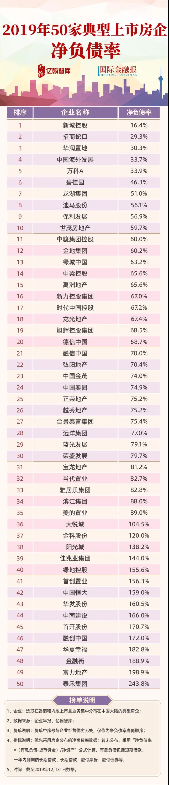 EH50房企平均净负债率下降至94%,但仍有企业逆市上升——2019年EH50房企净负债率