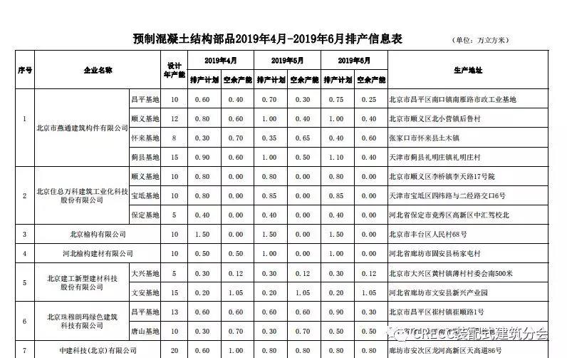 装配式建筑部品生产企业排产信息(2019年4月-6月)