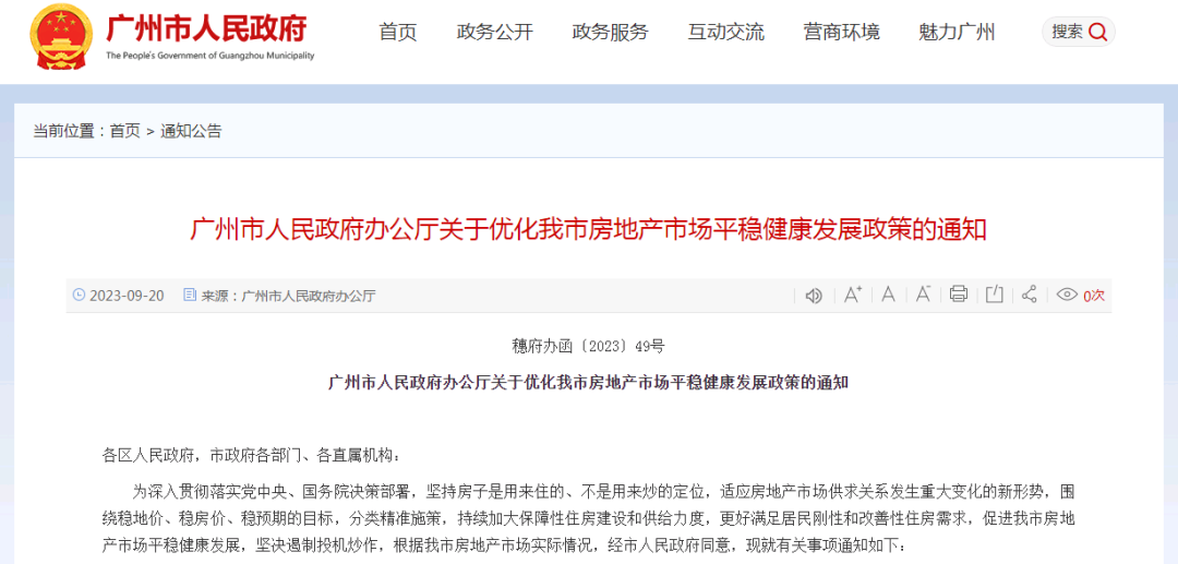 《广州市人民政府办公厅关于优化我市房地产市场平稳健康发展政策的通知》(穗府办函〔2023〕49号)自2023年9月20日起执行,现将有关政策解读如下: