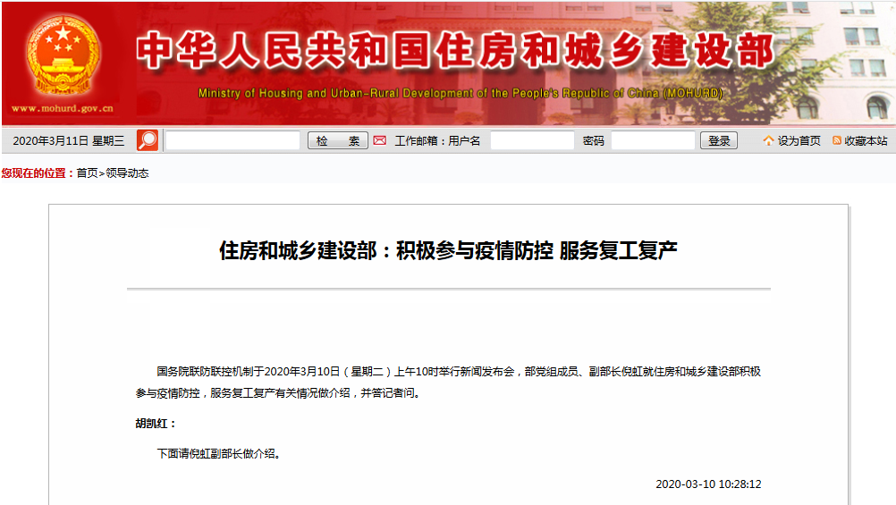 国务院联防联控机制于2020年3月10日(星期二)上午10时举行新闻发布会,部党组成员、副部长倪虹就住房和城乡建设部积极参与疫情防控,服务复工复产有关情况做介绍,并答记者问。
