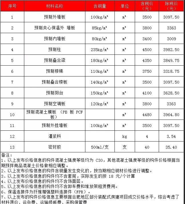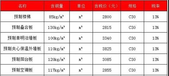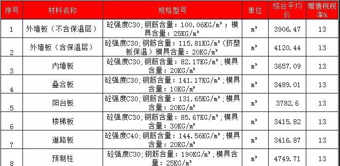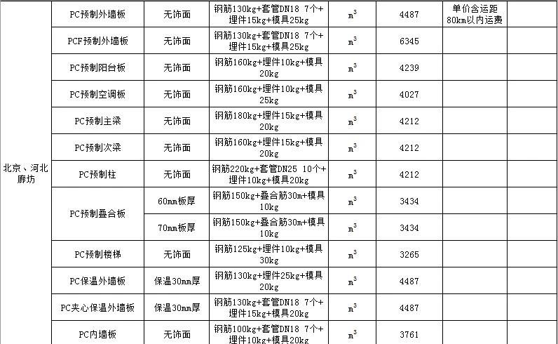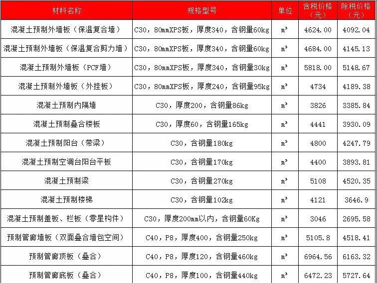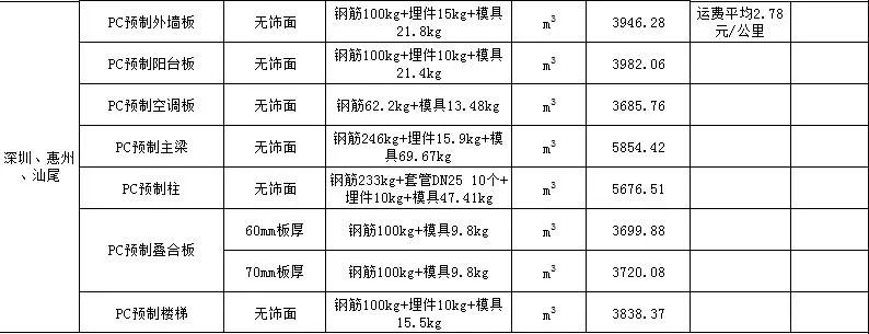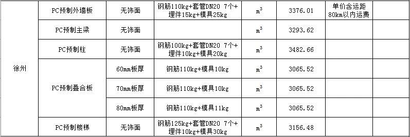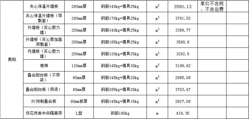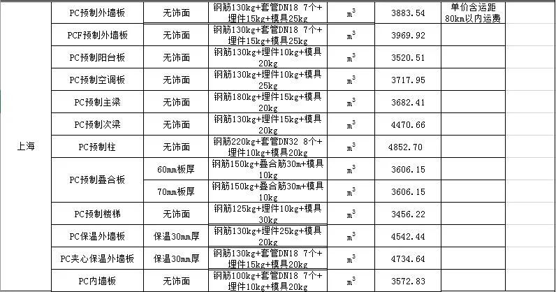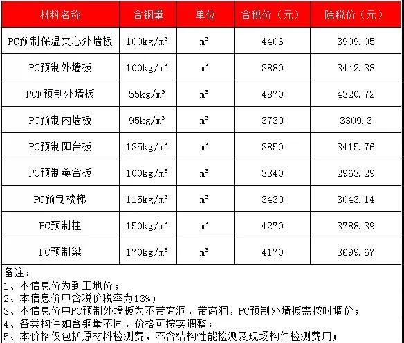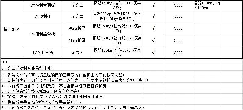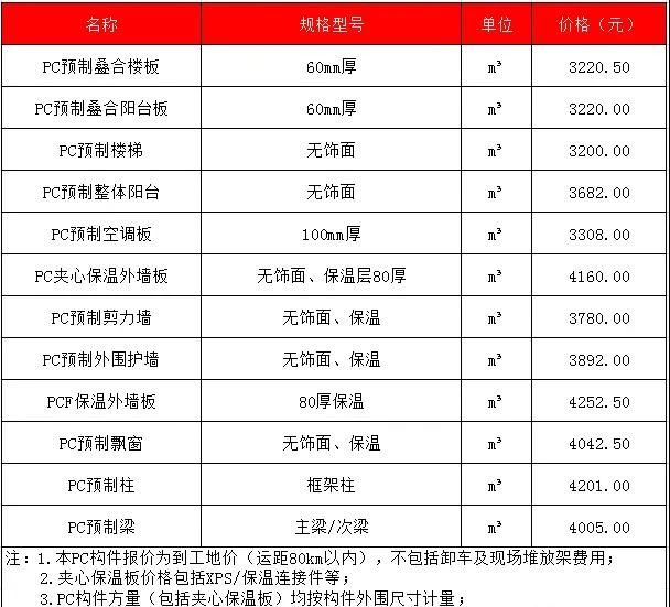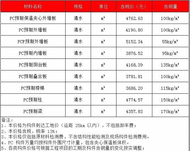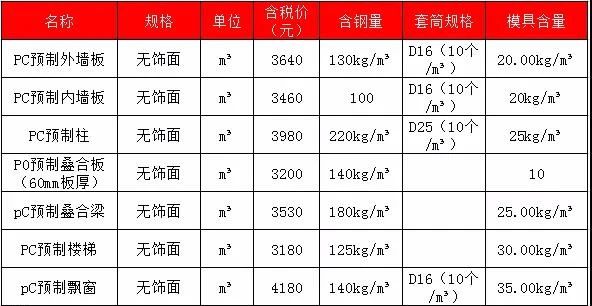 注:装配式建筑构件模具按正常加工工期考虑,价格含运费,构件深化设计费,不含卸车费,安装费,构件计量单位按构件体积计算,构件不带装饰面层。