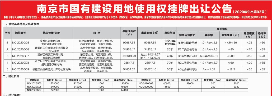 刚刚(3月26日),南京市规划和自然资源局在新华日报07版发布2020年宁出第3号出让公告,共公告5幅地块,分布于城中(1幅)、河西(2幅)、江宁(1幅)、仙林(1幅)。总用地面积近31公顷,起拍总价达117.56亿元,将于4月29日上午10:00开始网上竞拍。