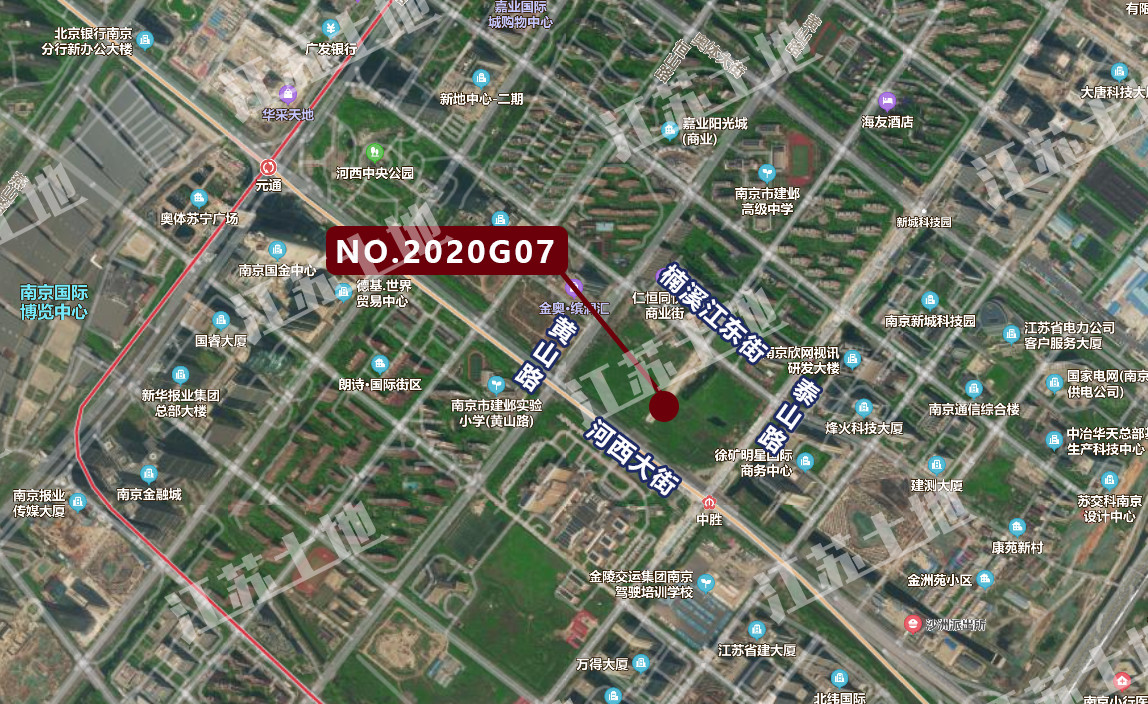 河西中G07地块(建邺区楠溪江东街以南、泰山路以西地块),东至泰山路,南至河西大街,西至黄山路,北至楠溪江东街。总用地面积102643.73㎡,出让面积地上:84244.67㎡,地下:18399.06㎡,用地性质商办混合用地,综合容积率5.51,限高200米。起拍总价22.2亿,竞买保证金4.44亿元。
