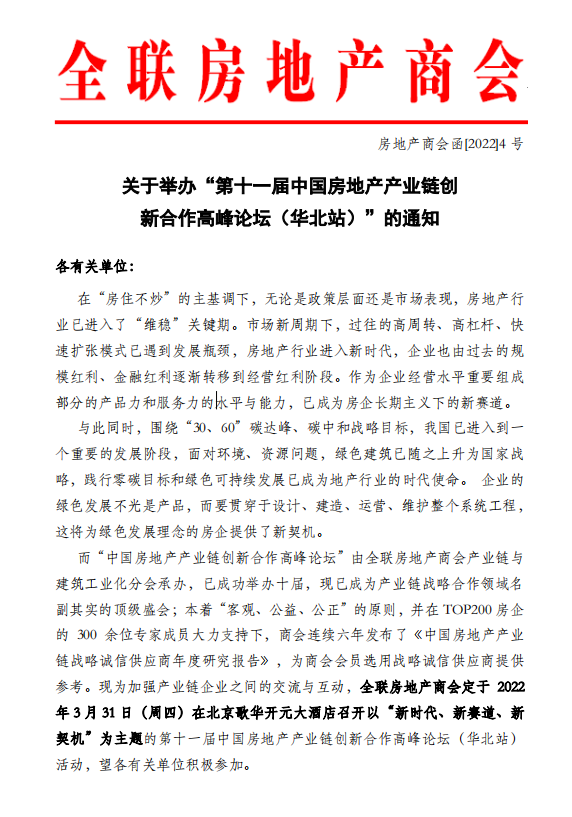 面对行业变革带来的考验,积极调整新赛道、拥抱新技术是房地产及相关企业重塑增长与转型的必然选择,为此,全联房地产商会将于2022年3月31日,召开以【新时代、新赛道、新契机】为主题的第十一届中国房地产产业链创新合作高峰论坛(华北站)本次论坛将携手国央企、城投房企及华北区百余家主流房企、绿色健康、智慧科技及供应链领域主流品牌供应商代表,就新时代、新赛道、新契机这一主题,围绕“行业变革挑战,新技术趋势,转型发展思路”等关键词,进行深入的探讨与交流。