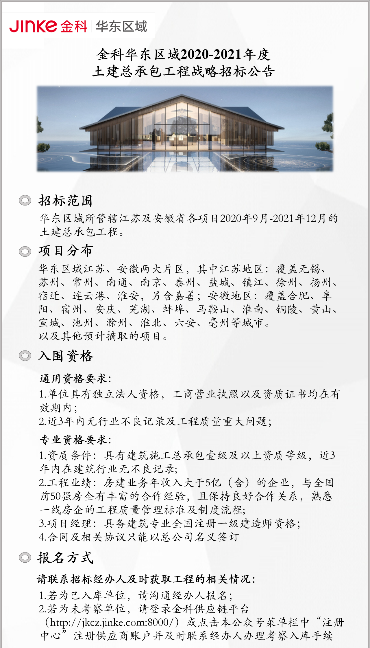 链筑网 招采信息 金科华东2020-2021年度总承包工程战略招标公告