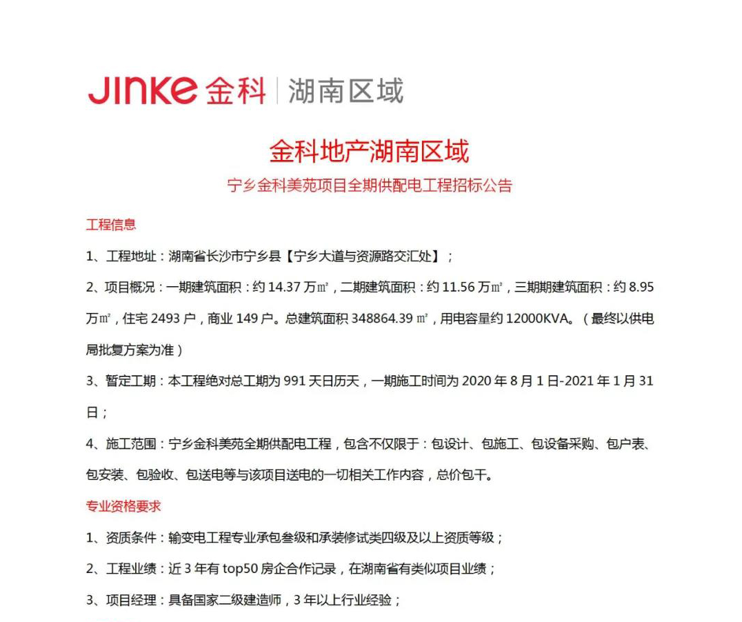 链筑网 招采信息 金科地产湖南区域宁乡金科美苑项目全期供配电工程招标公告