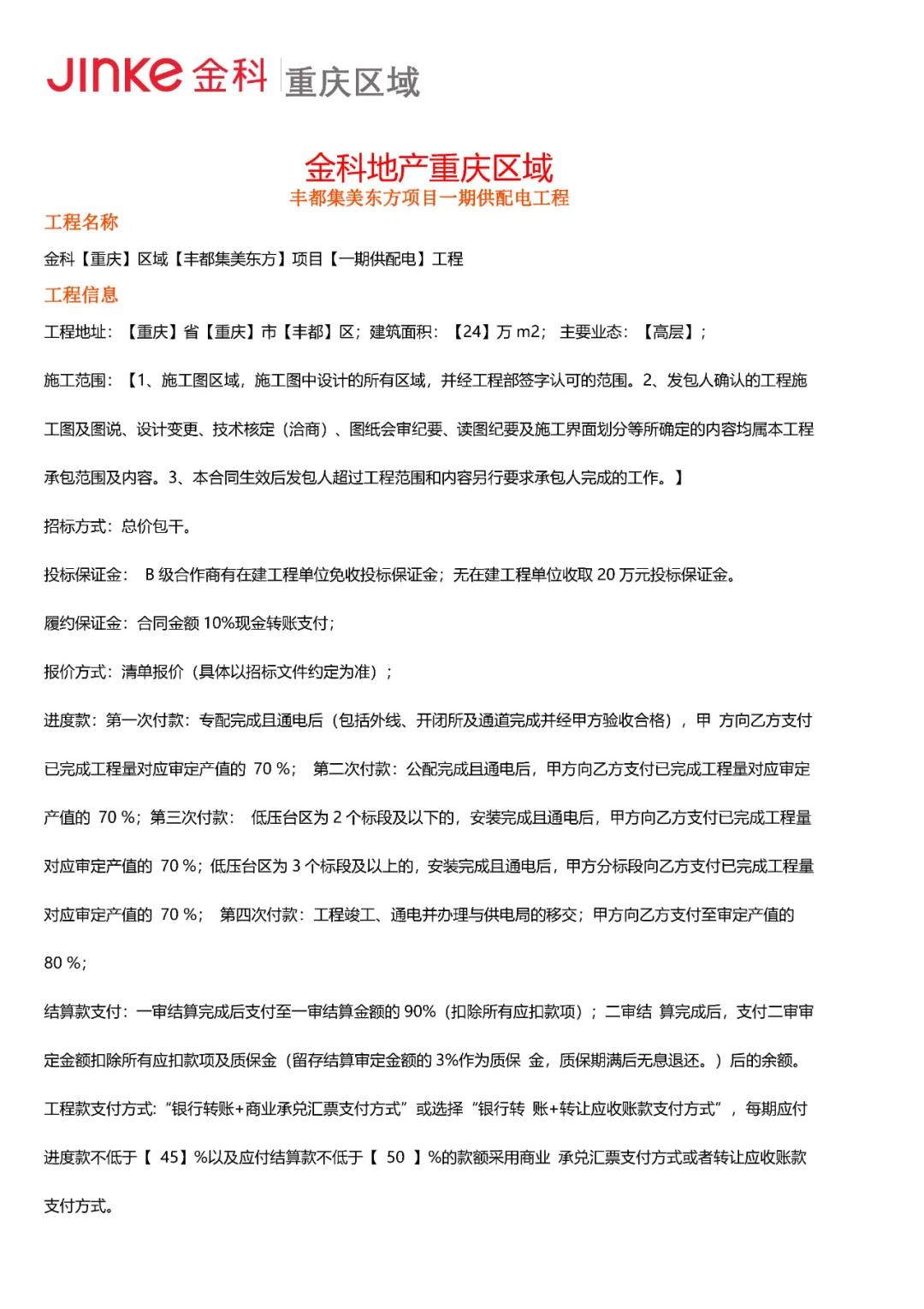 金科地产重庆区域丰都集美东方项目一起供配电工程招标公告、长寿金科世界城项目幕墙工程招标公告