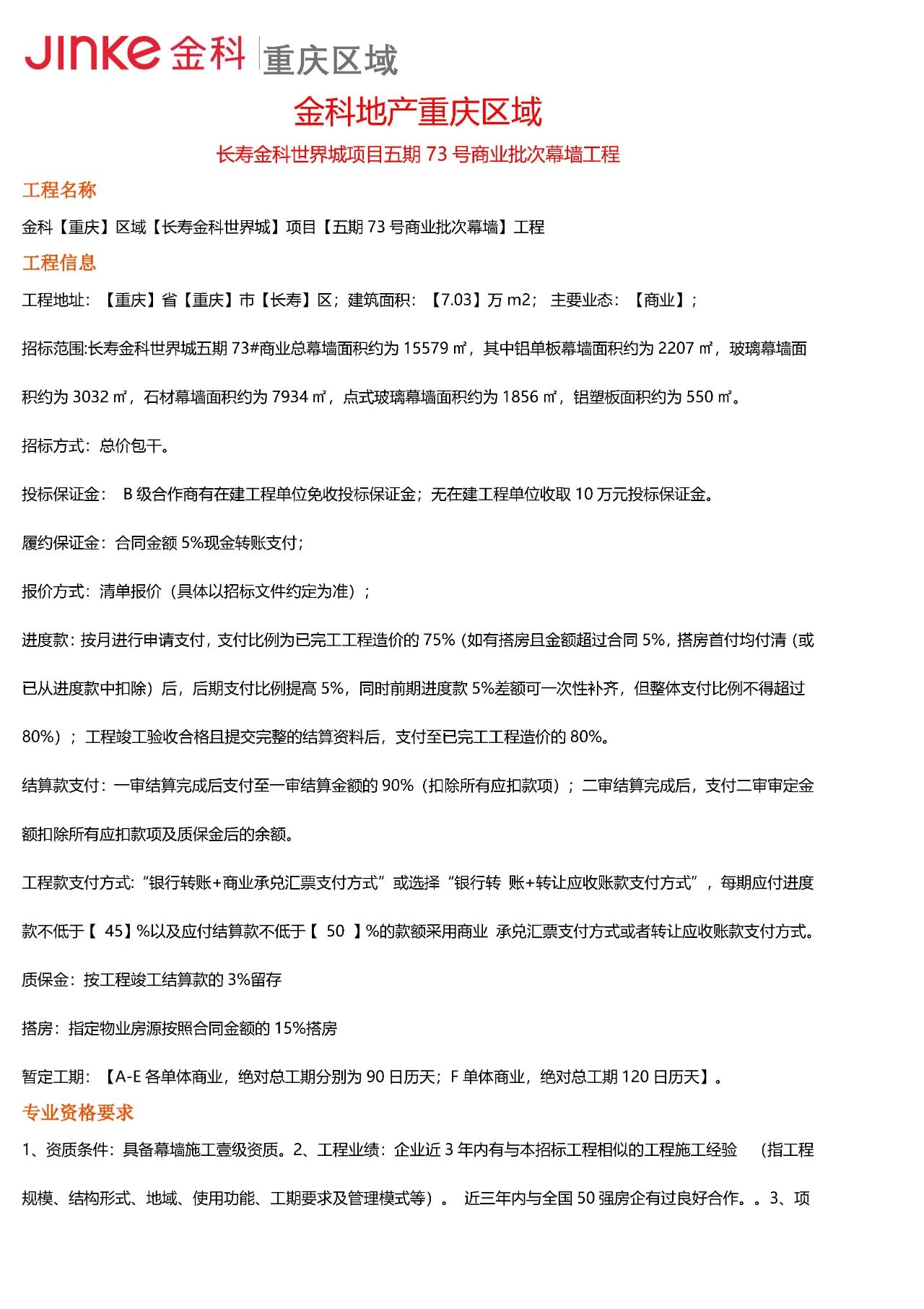 链筑网 招采信息 金科地产重庆区域丰都集美东方项目一起供配电工程招标公告、长寿金科世界城项目幕墙工程招标公告