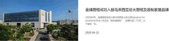 2020年4月,金牌厨柜成功入股马来西亚上市公司Signature International Bhd(中文名“胜利者国际”,股票代码:7246,以下简称“SIB”),持续推进品牌国际化。SIB是马来西亚最大、东南亚品牌知名度最高的厨柜及定制家居品牌,在本土具有强大的品牌影响力和实力。